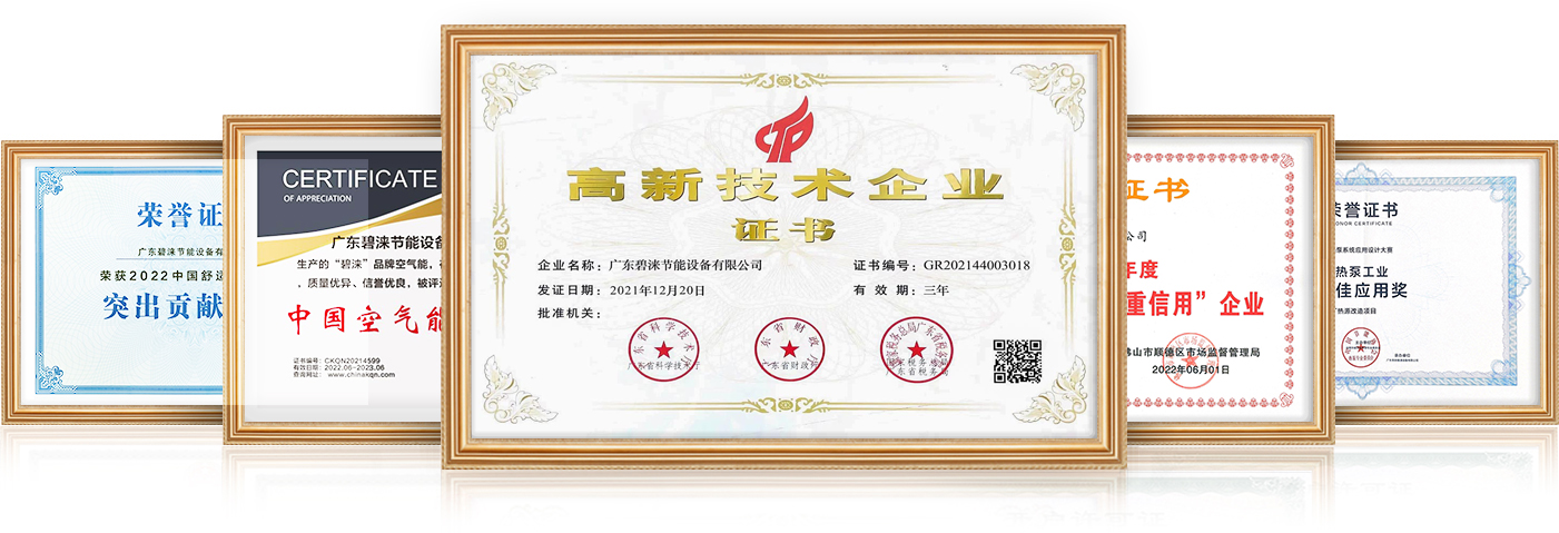 智博自行研发、设计、生产的空气源热泵系列产品已获得各项国家专利200多项,其中发明专利6项,并多次获得国家、省级科技创新奖励。产品已全线通过国家CCC认证、ISO9001质量体系认证、ISO14001环境体系认证、欧盟CE认证,还荣获了“热泵十佳名优品牌”、“广东省高新技术企业”、“佛山市首批星光企业”、“广东省守合同重信用企业”、“泳池温泉SPA行业产品质量奖”等多项品牌荣誉。