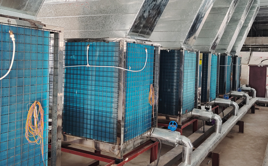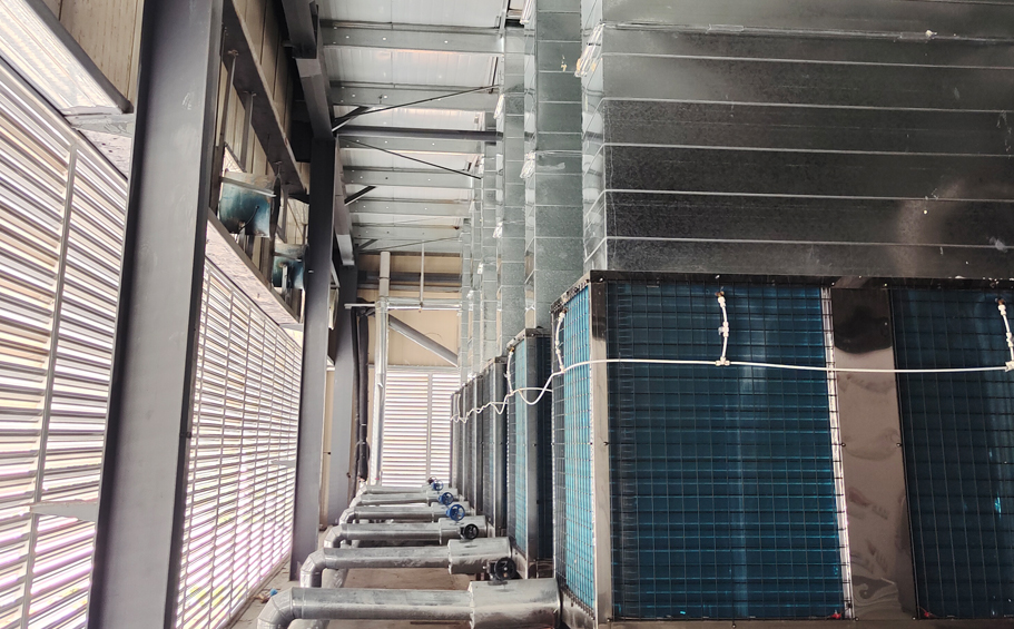 山西省运城市某中央厨房空气能热泵冷暖工程,采用12台RB-102K(30匹)碧涞风冷模块带热回收机组,满足该中央厨房约5000平方米的制冷、供暖及每天约20吨生活热水的需求。