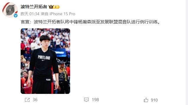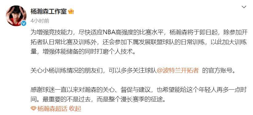 随后,杨瀚森职责室更新社媒发声:“为增强竞手段力,尽快顺应NBA高强度的比赛水平,杨瀚森将于即日起,除参加设备者队日常比赛及考验外,还会参加下属发展定约球队的日常考验,以此加大考验量,增强体能储备的同期打磨个东谈主本领。”