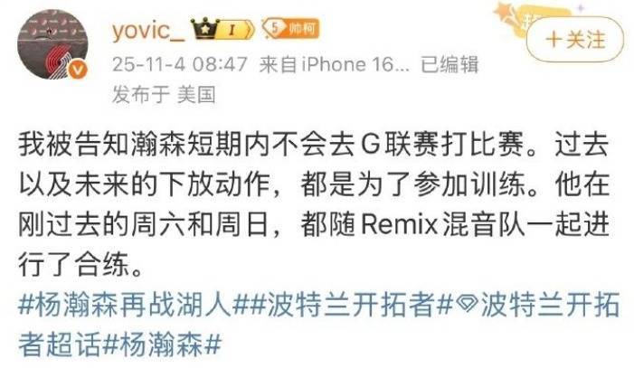 另据红星新闻音问,北京时候11月4日,据设备者队记yovic报谈,他被讲演杨瀚森短期内不会去G联赛(发展定约)打比赛。畴昔以及改日的下放当作,齐是为了参加考验。在刚畴昔的周六和周日,杨瀚森齐跟着附庸球队混音队全部进行了合练。