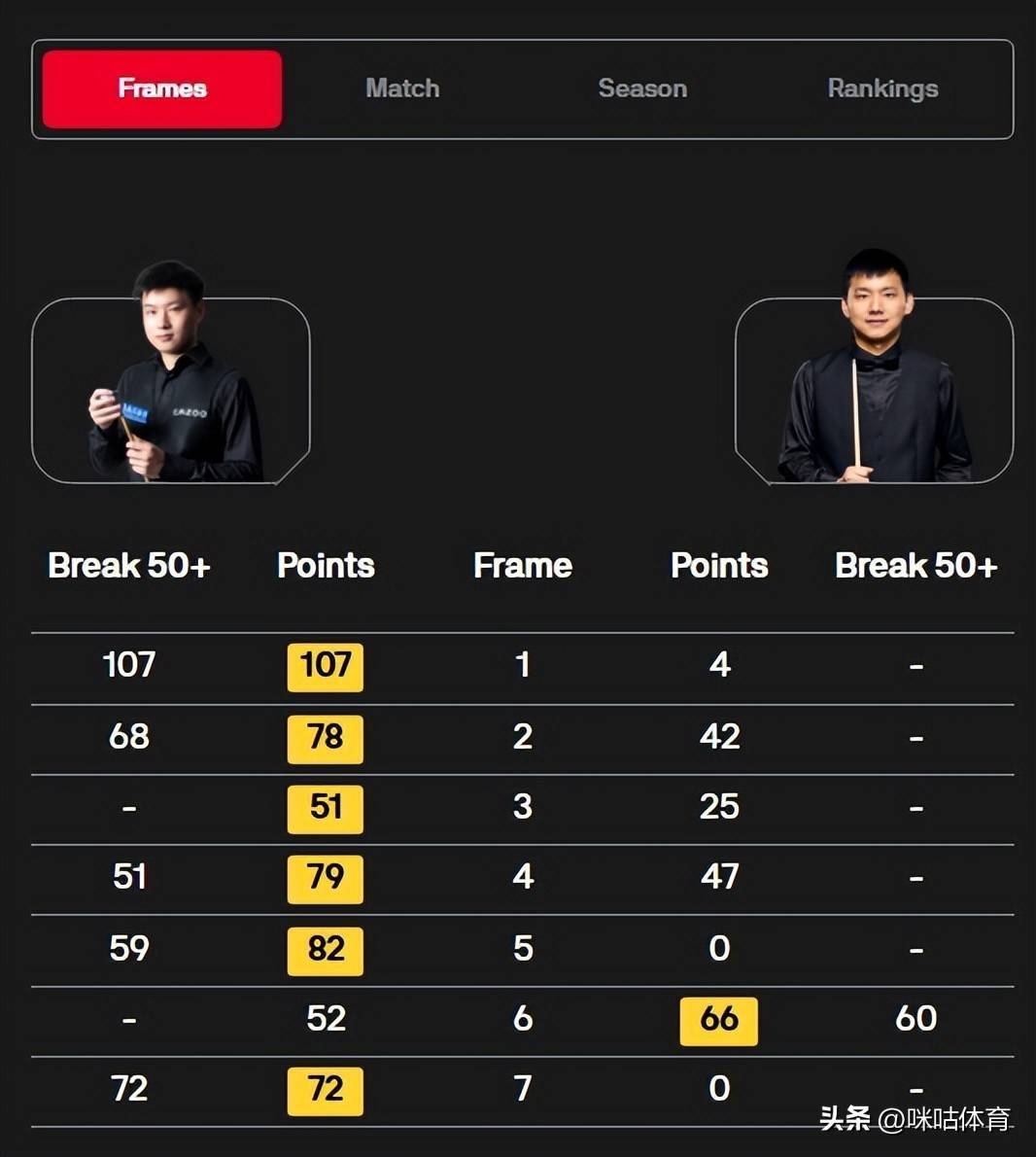 本场比赛,赵心童火力全开,轰出一杆107分的破百,并另有四杆50+(68、51、59、72)的出色发扬。比赛开首他便飞速插足景况,上半场连赢四局,获取4-0的卓绝。第五局,赵心童在缠斗中把抓住契机,再轰单杆59分,以5-0卓绝并领先拿到赛点。尽管龙泽煌在第六局凭借一杆60分并红运晕进粉球,扳回一城,但赵心童在第七局莫得给敌手任何契机,以一杆72分干净利落地锁定胜局。