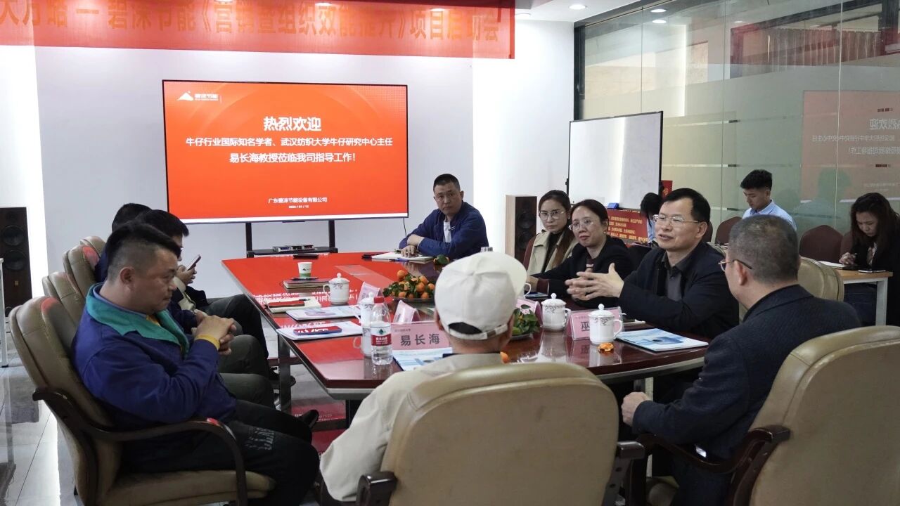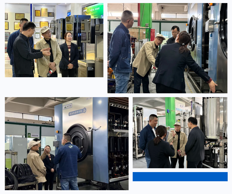 交流环节中,易教授既分享了牛仔洗水行业前沿经验,也与技术部聚焦温度控制展开探讨:他高度认可热泵烘干机“逐步升温”的设计,认为相比传统蒸汽设备“瞬间超100℃”的加热方式,这种模式更能保护布草纤维、降低破损率。同时,他还解答了洗水厂客户对接的实操难题,并给出品牌推广“双线策略”:一是通过销售员定向触达洗水厂终端;二是联动上游品牌绿色生产需求、结合政府“零碳园区”“双碳目标”政策进行推广。