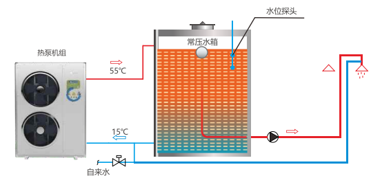 循环式的痛点:传统方式需对整箱水反复加热,后期水温越高,压缩机负荷越大,能效(COP)急剧下降,耗电剧增。