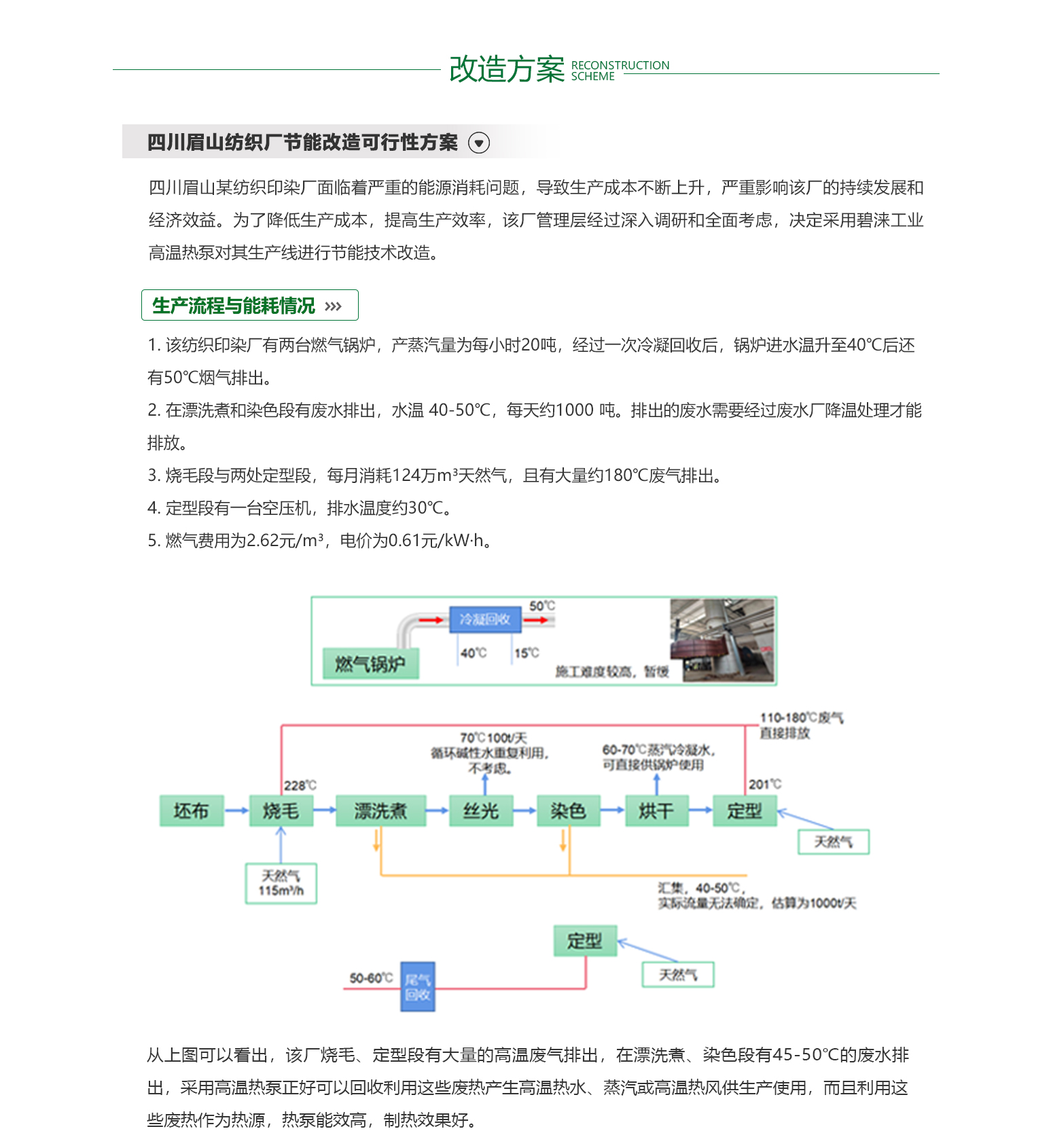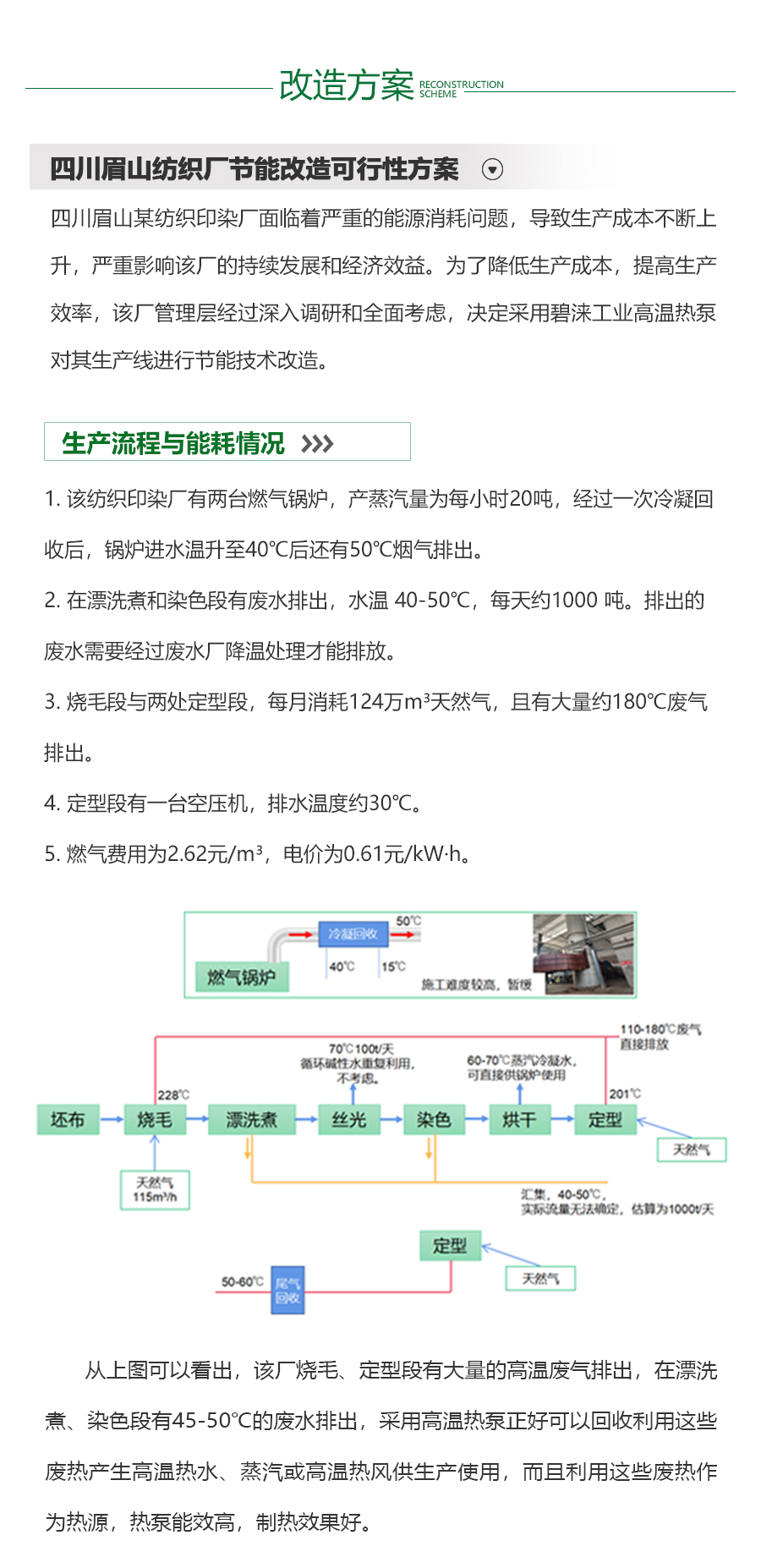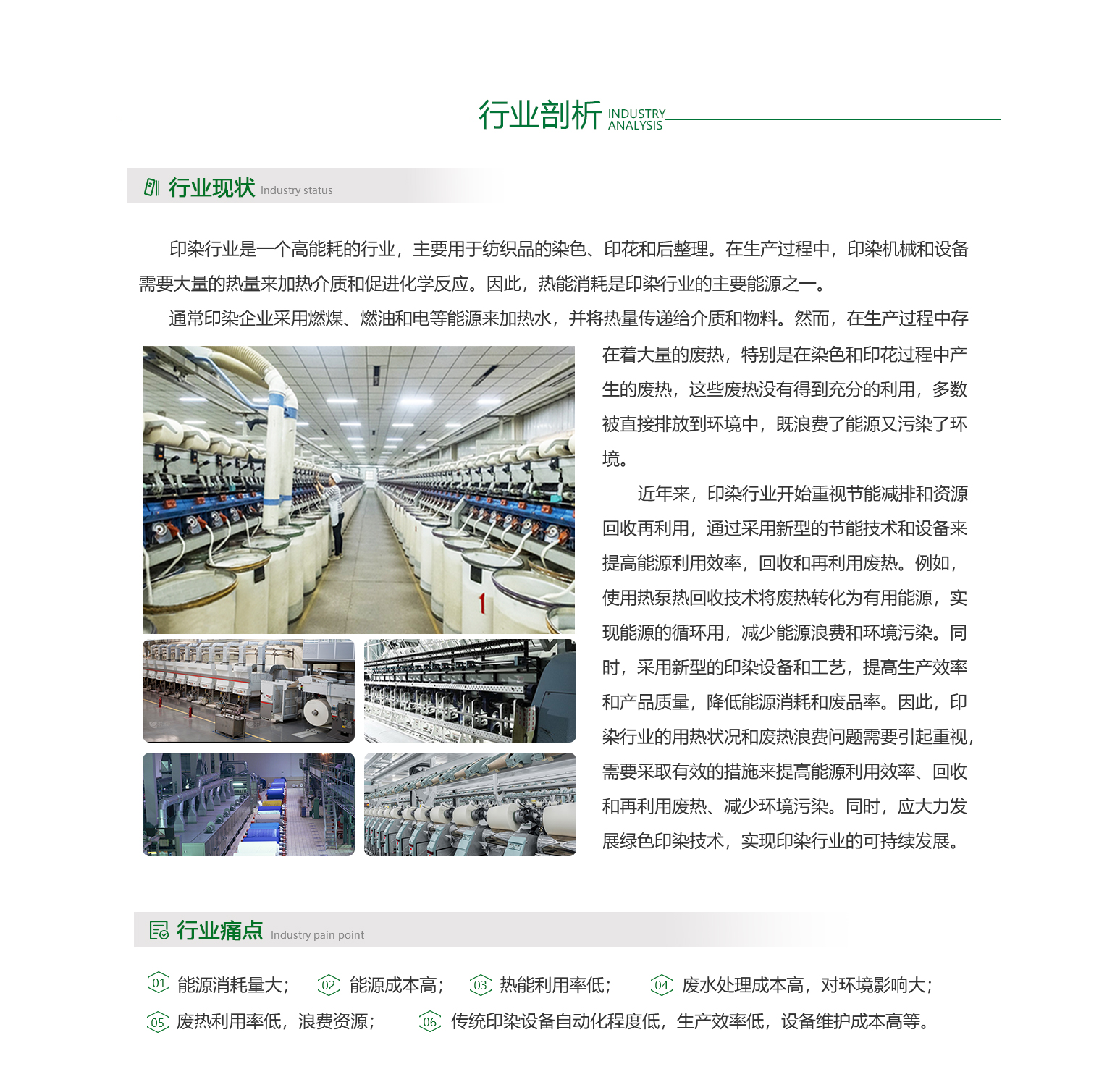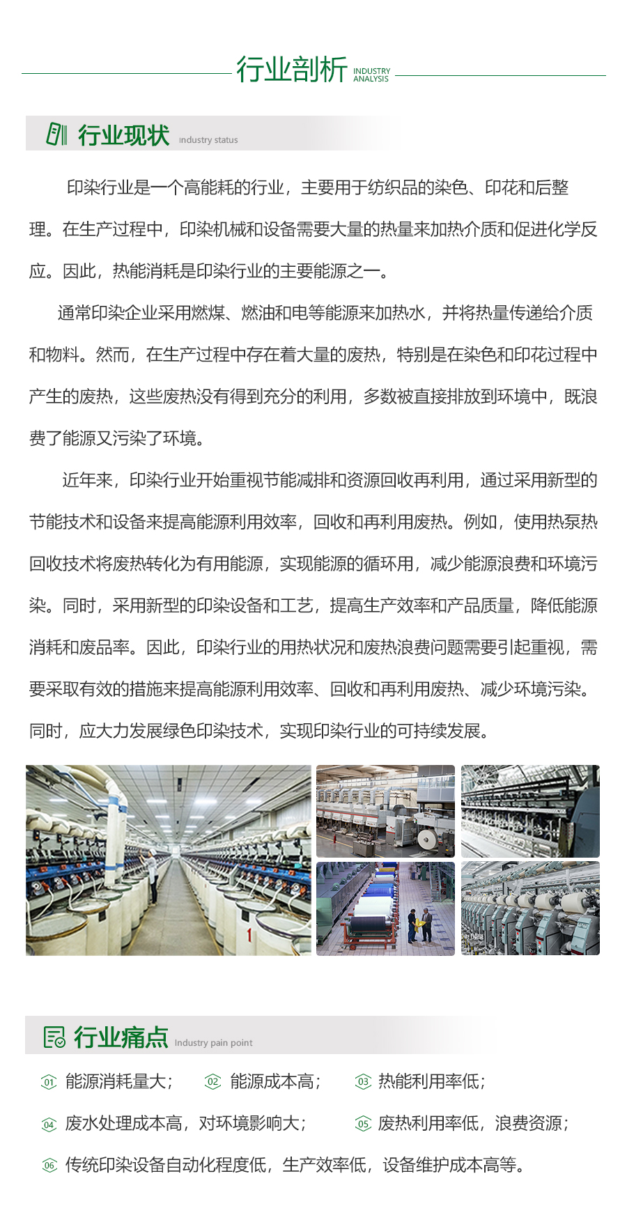 - 印染行业是一个高能耗、高用热的行业,它需要大量的能源和水来支持其生产过程。目前,印染企业大多数仍在使用传统的燃煤或燃油锅炉等设备来提供热能,这些设备的能效较低,造成了大量的能源浪费。此外,印染过程中产生的废热和废水,如果不加以处理,会对环境造成严重的污染。目前,虽然一些印染企业已经开始采用余热回收等环保措施,但仍有大多数企业缺乏有效的环保措施,对环境造成了严重的威胁。