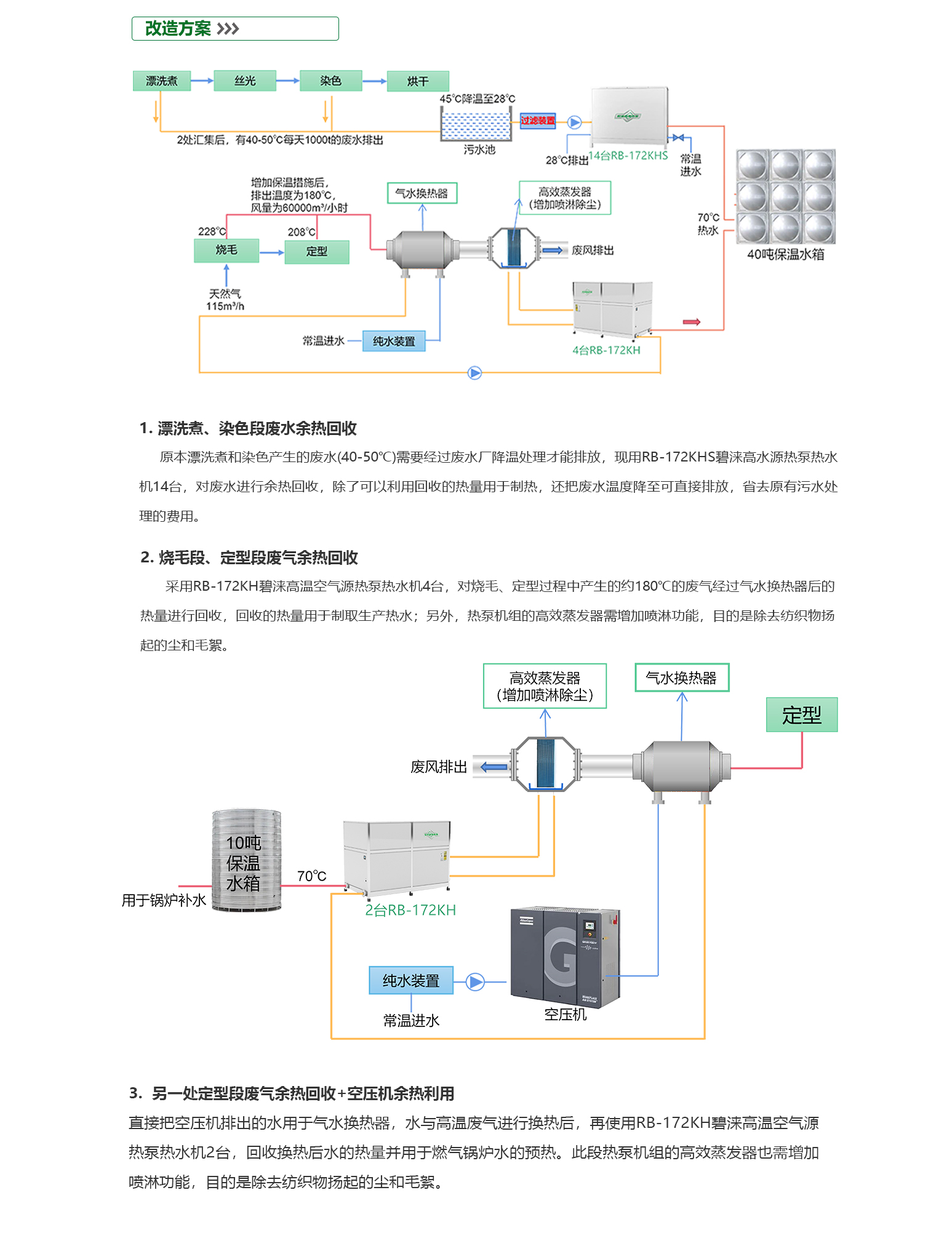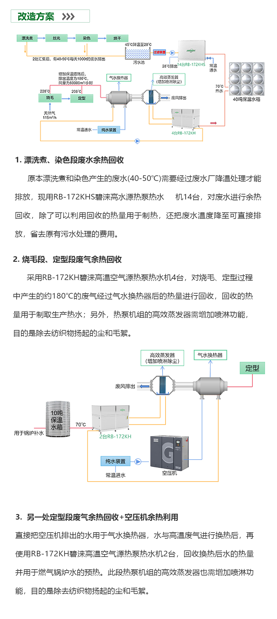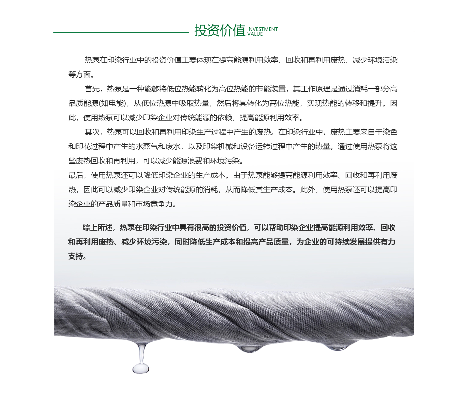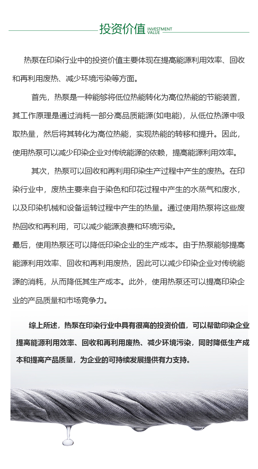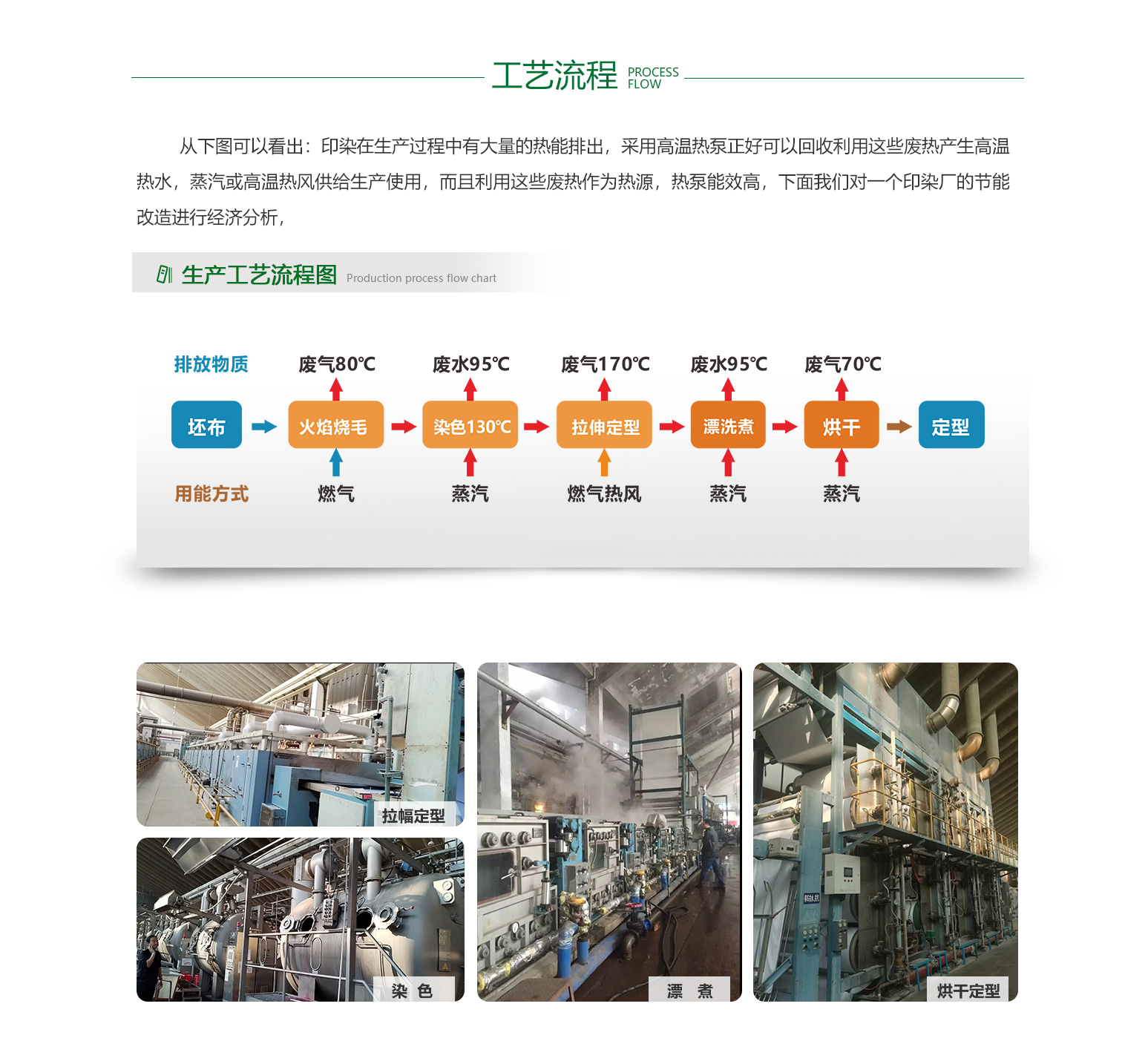 - 印染行业是一个高能耗、高用热的行业,它需要大量的能源和水来支持其生产过程。目前,印染企业大多数仍在使用传统的燃煤或燃油锅炉等设备来提供热能,这些设备的能效较低,造成了大量的能源浪费。此外,印染过程中产生的废热和废水,如果不加以处理,会对环境造成严重的污染。目前,虽然一些印染企业已经开始采用余热回收等环保措施,但仍有大多数企业缺乏有效的环保措施,对环境造成了严重的威胁。
