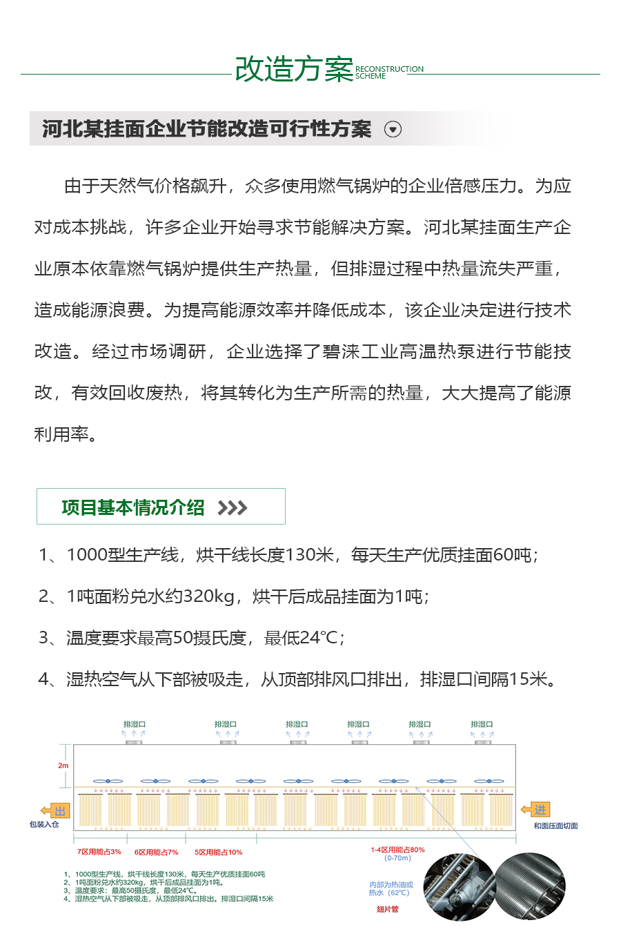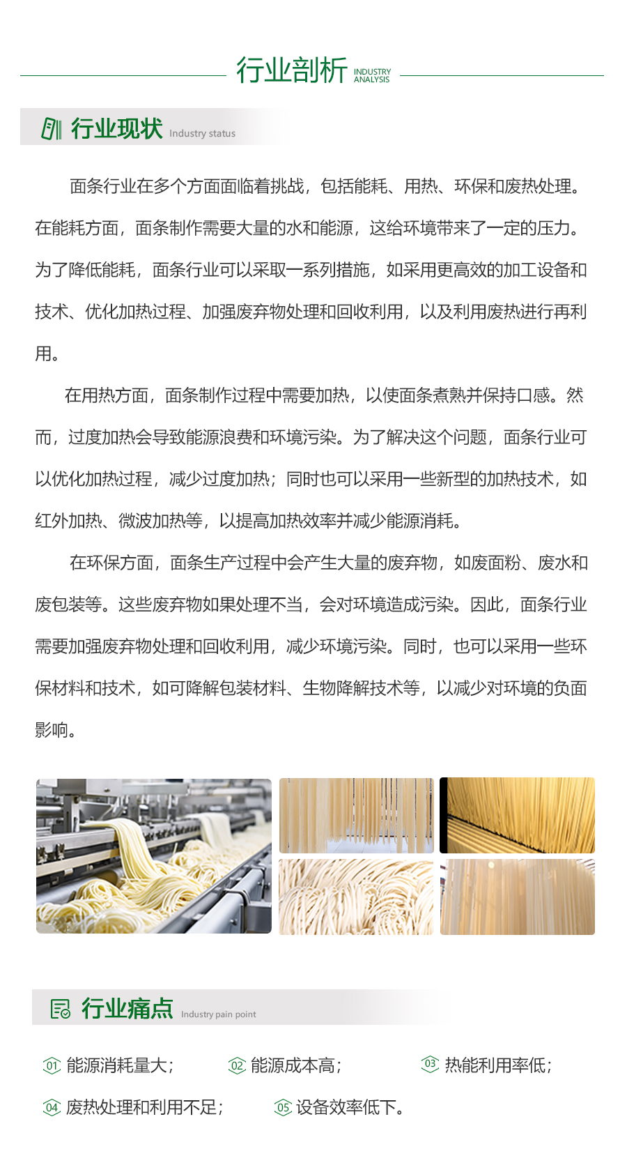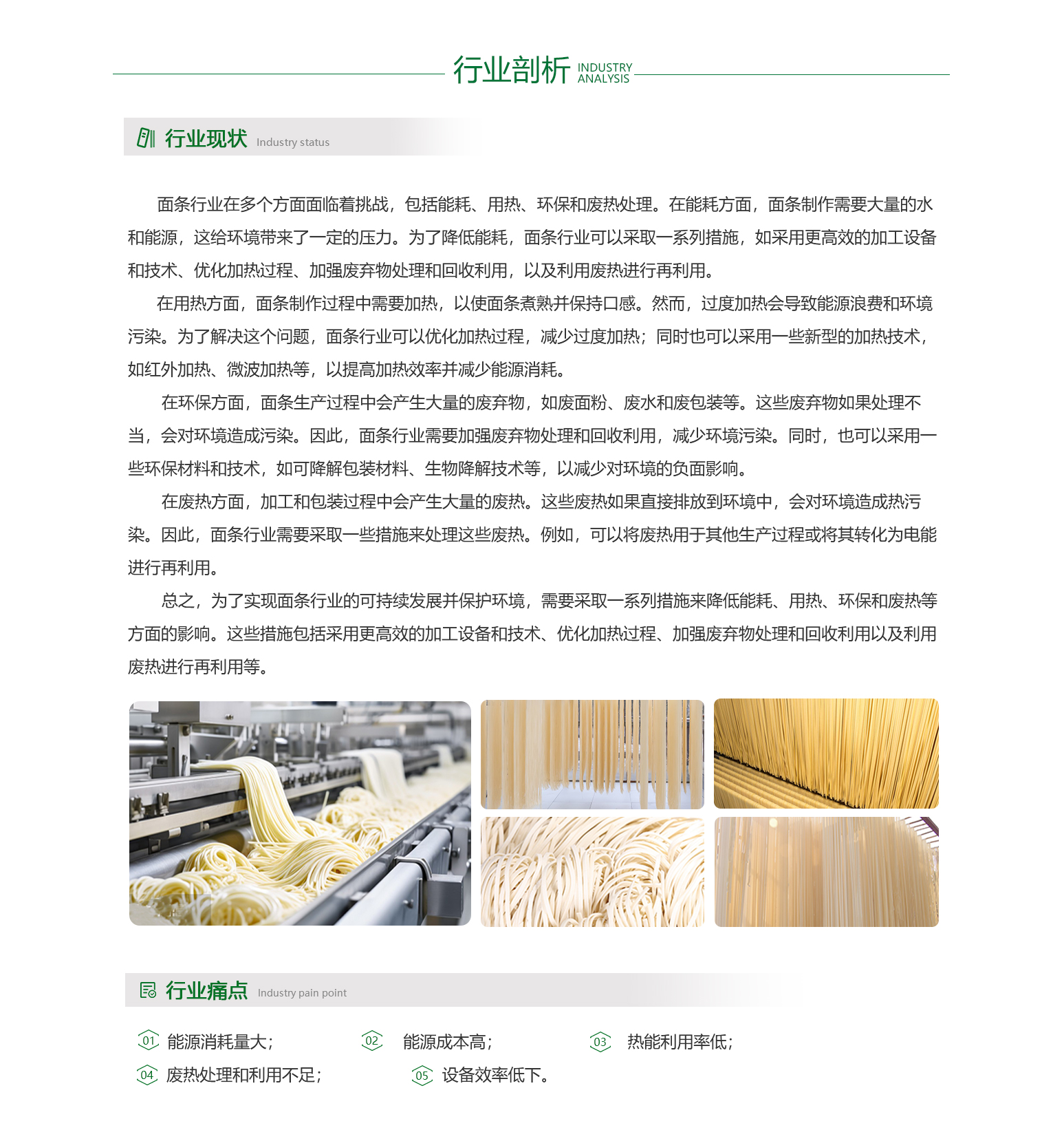 - 面条行业在生产过程中需要大量的热能,通常通过燃烧燃料或使用电热设备来产生。然而,在目前的用热状况下,废热的浪费现象普遍存在。这是因为传统的面条生产线在处理废热时缺乏有效的回收和利用措施,导致大量的热量被浪费。这种废热浪费不仅增加了能源成本,还对环境造成了负面影响。为了解决这个问题,面条行业需要采取措施来提高设备的能效和废热的利用效率。这可以通过采用先进的生产工艺和技术,如热回收系统和废热利用技术,来实现能源的节约和环境的保护。