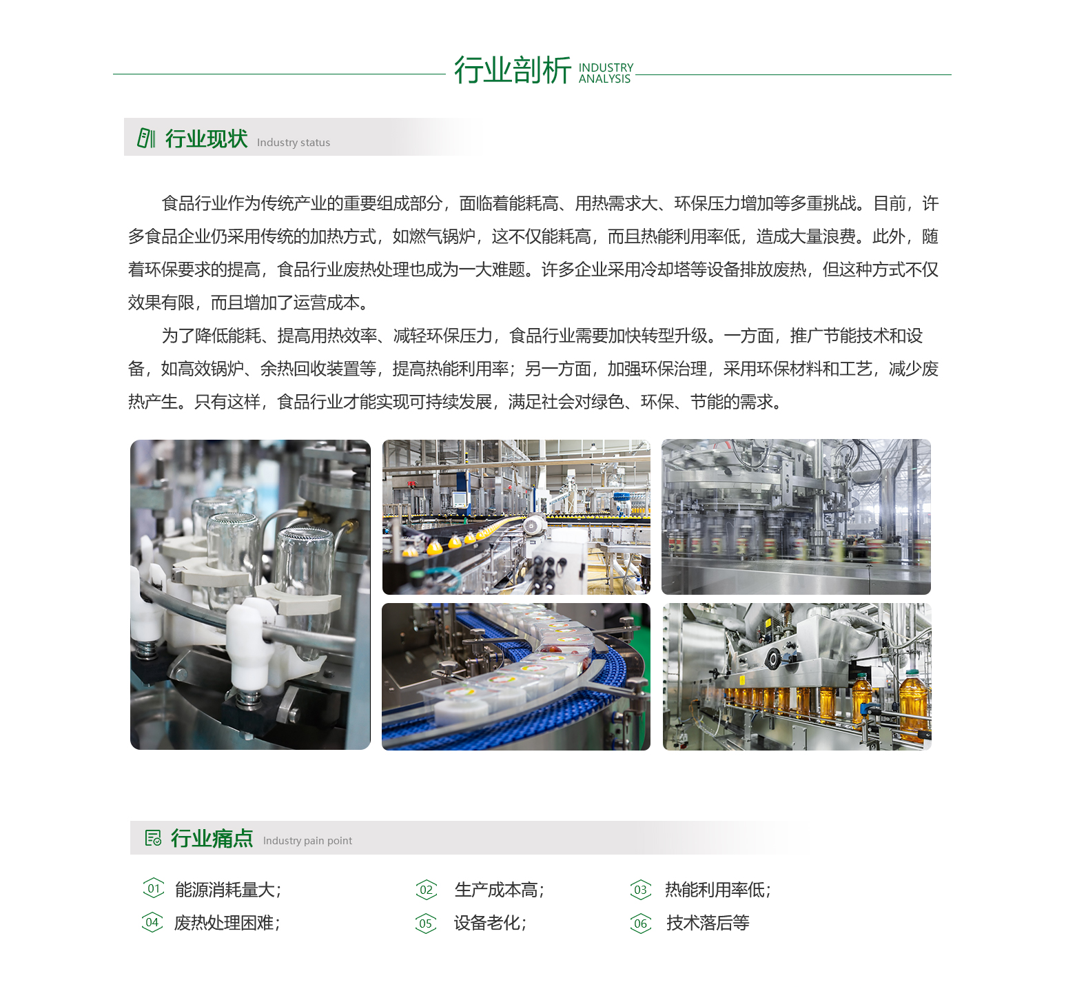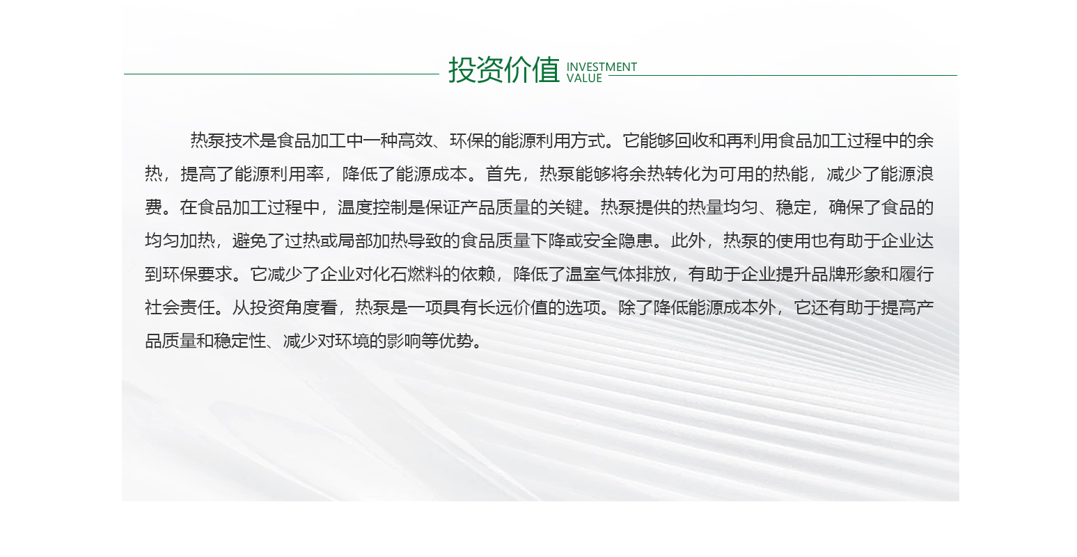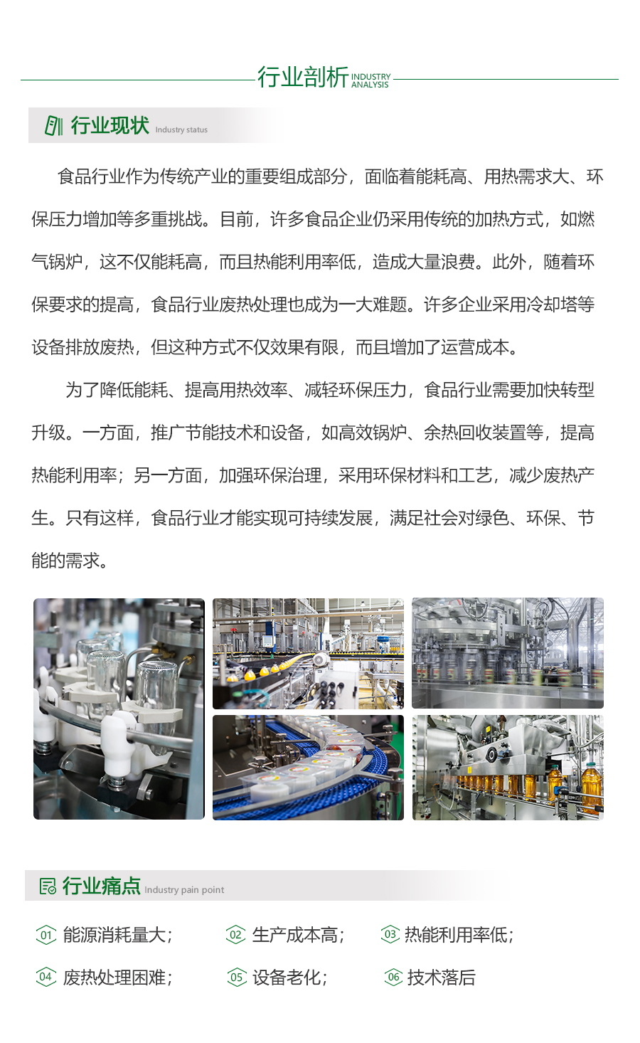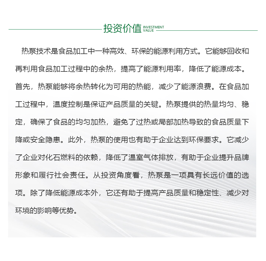 - 食品行业作为国民经济的重要组成部分,能耗和能源成本一直是企业关注的焦点。随着环保意识的增强和能效要求的提高,如何有效处理废热并加以利用,已成为食品企业降低能耗、提高经济效益的重要手段。在食品生产过程中,设备是能耗大户。企业应优先选择能效高、能耗低的设备,同时加强设备的维护和管理,确保其正常运行,减少不必要的能源浪费。对于废热的处理,可采用先进的热回收技术,将余热转化为有用能源,用于其他生产环节或供暖、制冷等需求,从而实现能源的循环利用。
