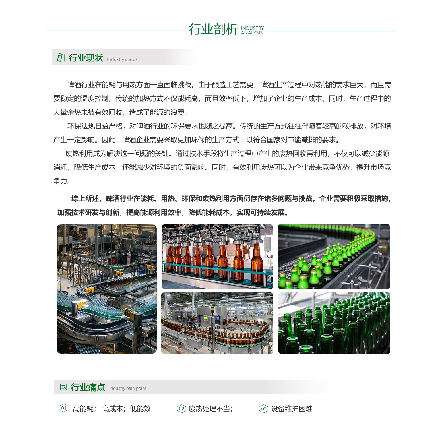 - 啤酒行业目前的用热状况普遍存在高能耗问题,生产过程中大量热能被消耗,同时废热往往未能得到有效利用,导致能源浪费严重。这种现状不仅增加了企业的能源成本,还对环境造成了负担。废热处理不当是行业面临的一大挑战,许多企业缺乏高效的废热回收和利用技术,使得原本可以转化为有用能源的废热被白白排放。因此,提高能效、降低能耗、加强废热利用成为啤酒行业亟待解决的问题。只有通过技术创新和设备升级,才能实现能源的高效转化和利用,推动行业的绿色可持续发展。
