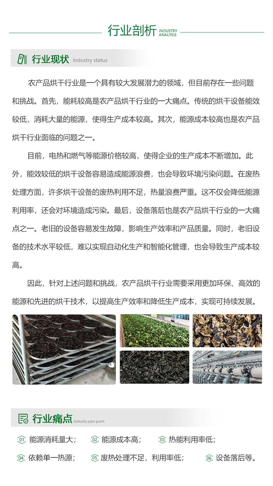 - 农产品烘干行业是一个具有较大发展潜力的领域,但目前存在一些问题和挑战。首先,能耗较高是农产品烘干行业的一大痛点。传统的烘干设备能效较低,消耗大量的能源,使得生产成本较高。其次,能源成本较高也是农产品烘干行业面临的问题之一。目前,电热和燃气等能源价格较高,使得企业的生产成本不断增加。此外,能效较低的烘干设备容易造成能源浪费,也会导致环境污染问题。在废热处理方面,许多烘干设备的废热利用不足,热量浪费严重。这不仅会降低能源利用率,还会对环境造成污染。