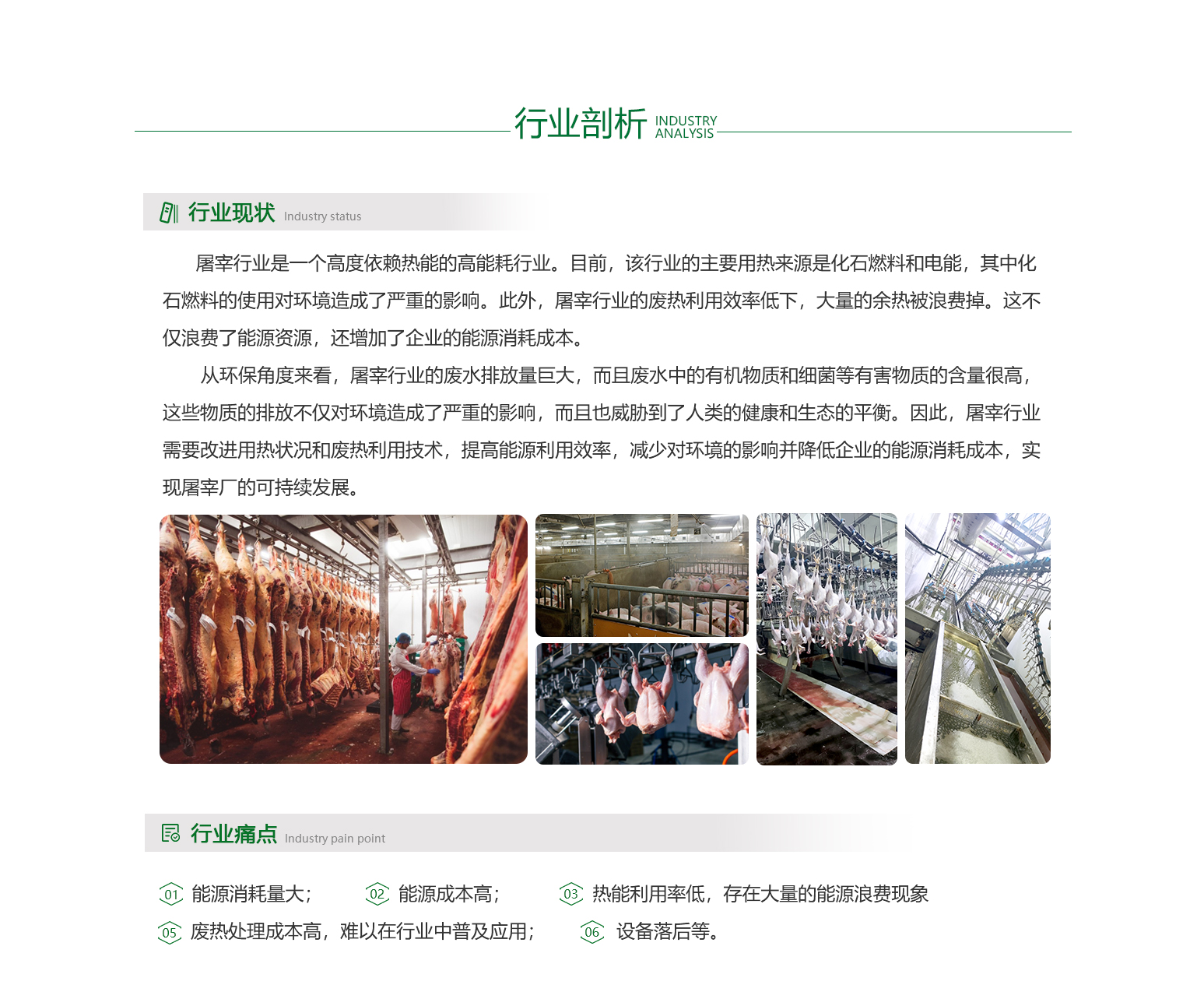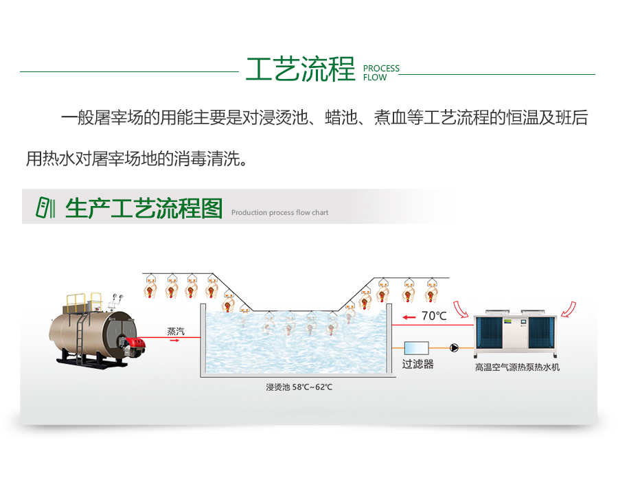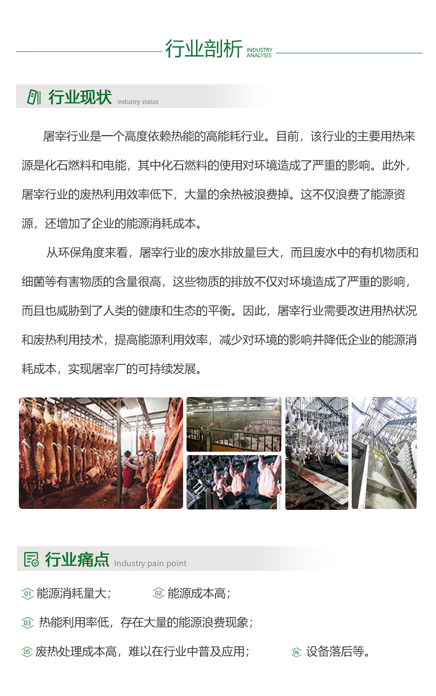 - 屠宰行业是一个高度依赖热能的高能耗行业。目前,该行业的主要用热来源是化石燃料和电能,其中化石燃料的使用对环境造成了严重的影响。此外,屠宰行业的废热利用效率低下,大量的余热被浪费掉。这不仅浪费了能源资源,还增加了企业的能源消耗成本。从环保角度来看,屠宰行业的废水排放量巨大,而且废水中的有机物质和细菌等有害物质的含量很高,这些物质的排放不仅对环境造成了严重的影响,而且也威胁到了人类的健康和生态的平衡。