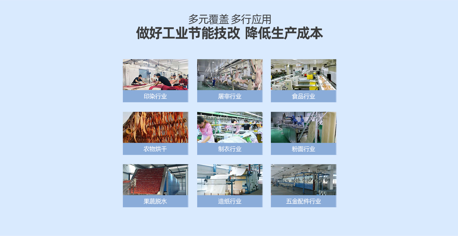 白酒行业 洗涤行业 注塑行业 食品行业 面条行业 饮料行业 农产烘干 屠宰行业 印染行业 五金行业 建材行业 啤酒行业 制药行业