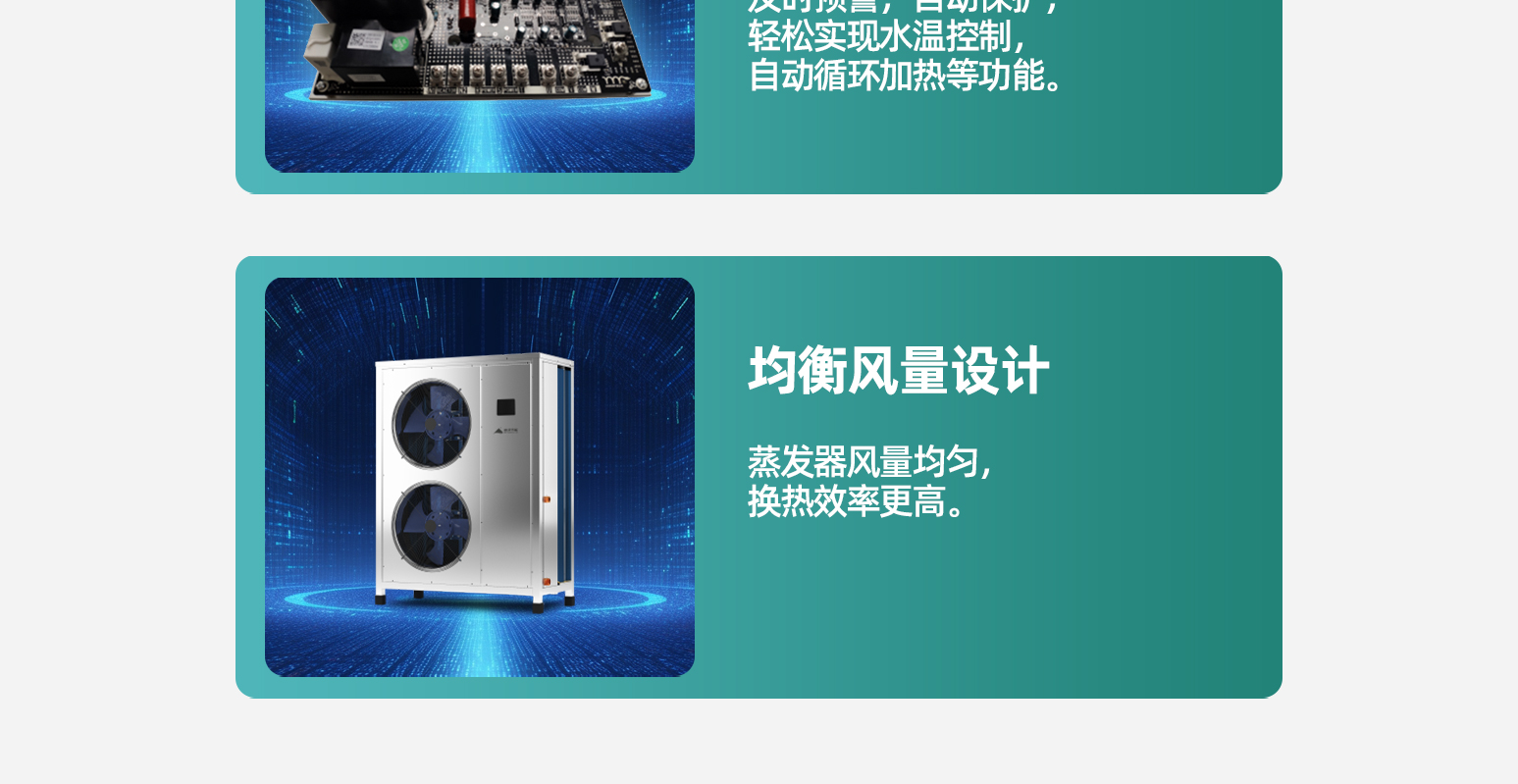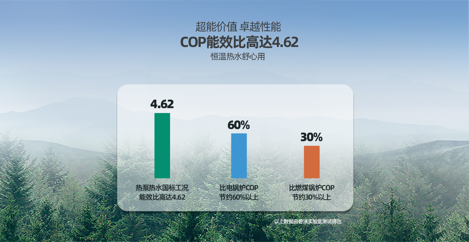 机组可全天候产水,且能效高,平均冷凝温度低,热水产量大,热水随时用。